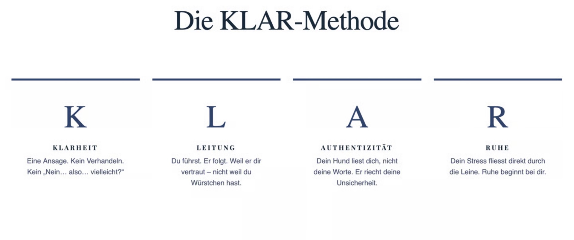Die KLAR-Methode® von Franziska Wallenaar basiert auf dem Prinzip, dass Hundetraining mit Verständnis beginnt und nicht mit Wiederholung von Kommandos oder Belohnungssystemen.